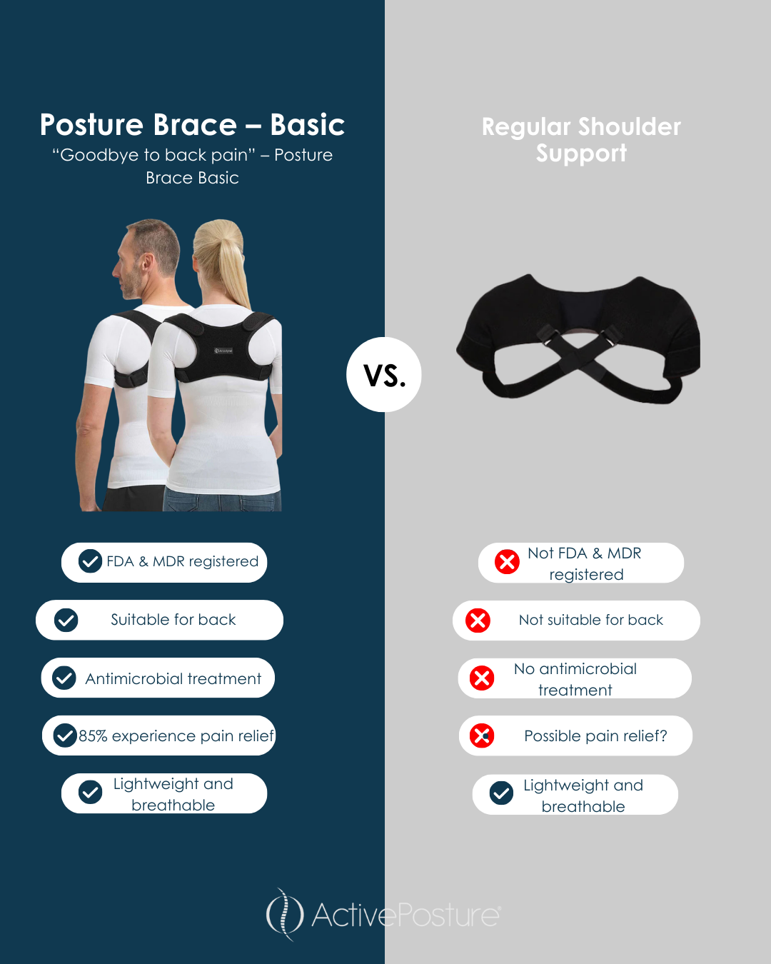 In comparison, a conventional shoulder support usually only provides basic support. It is neither FDA- nor MDR-registered, has no antimicrobial protection, and does not effectively help straighten the back. While it may offer some support, it often provides limited pain relief and less comfort.